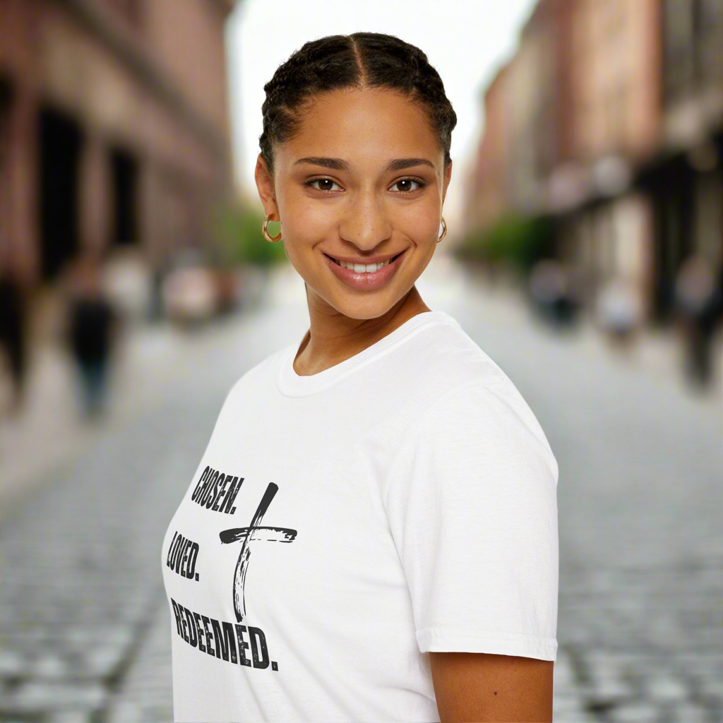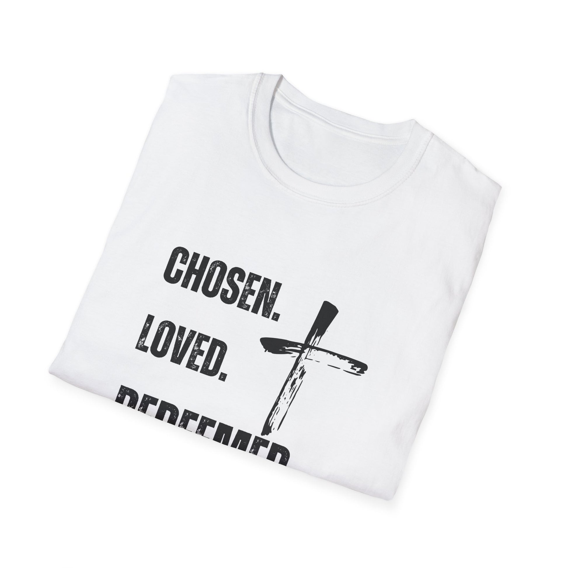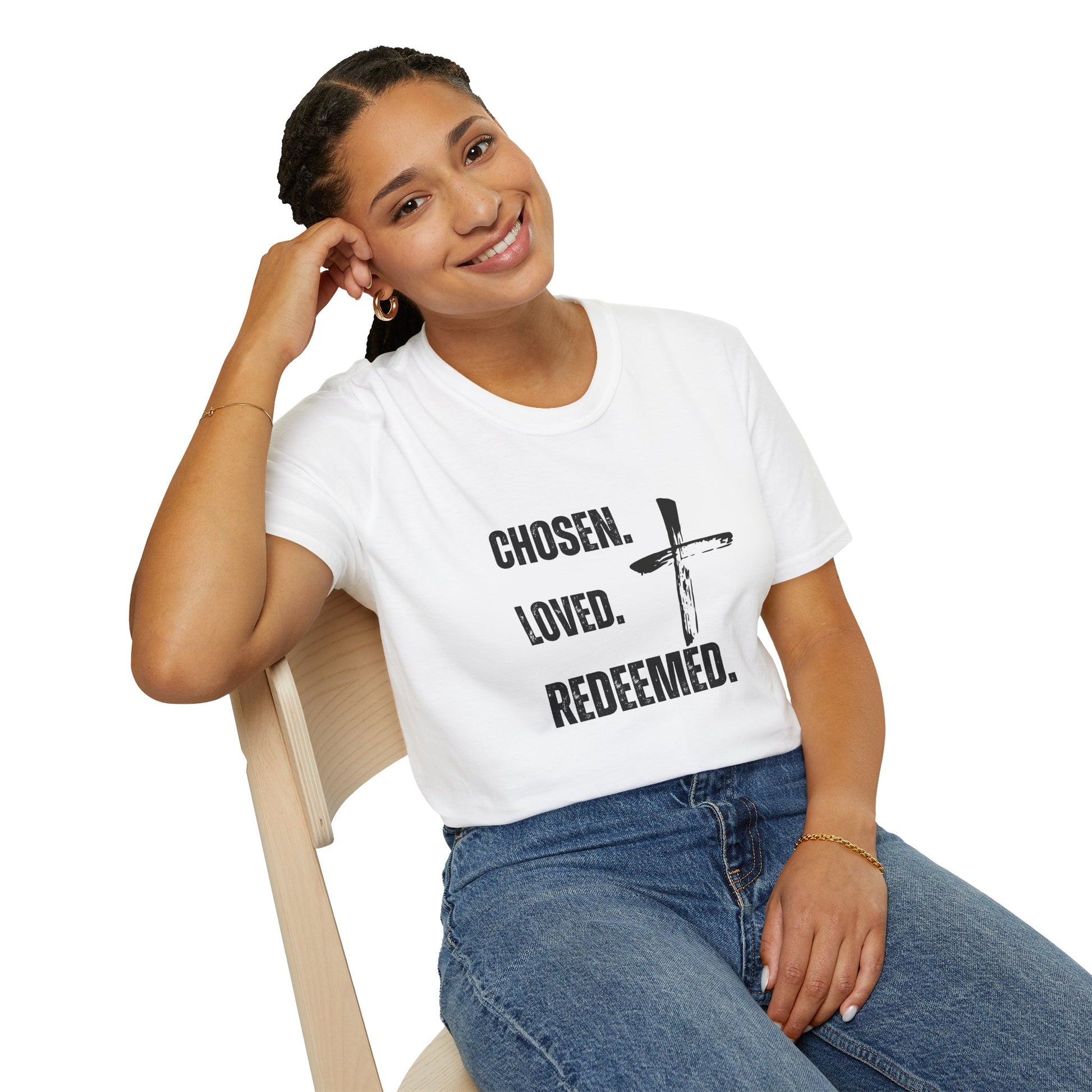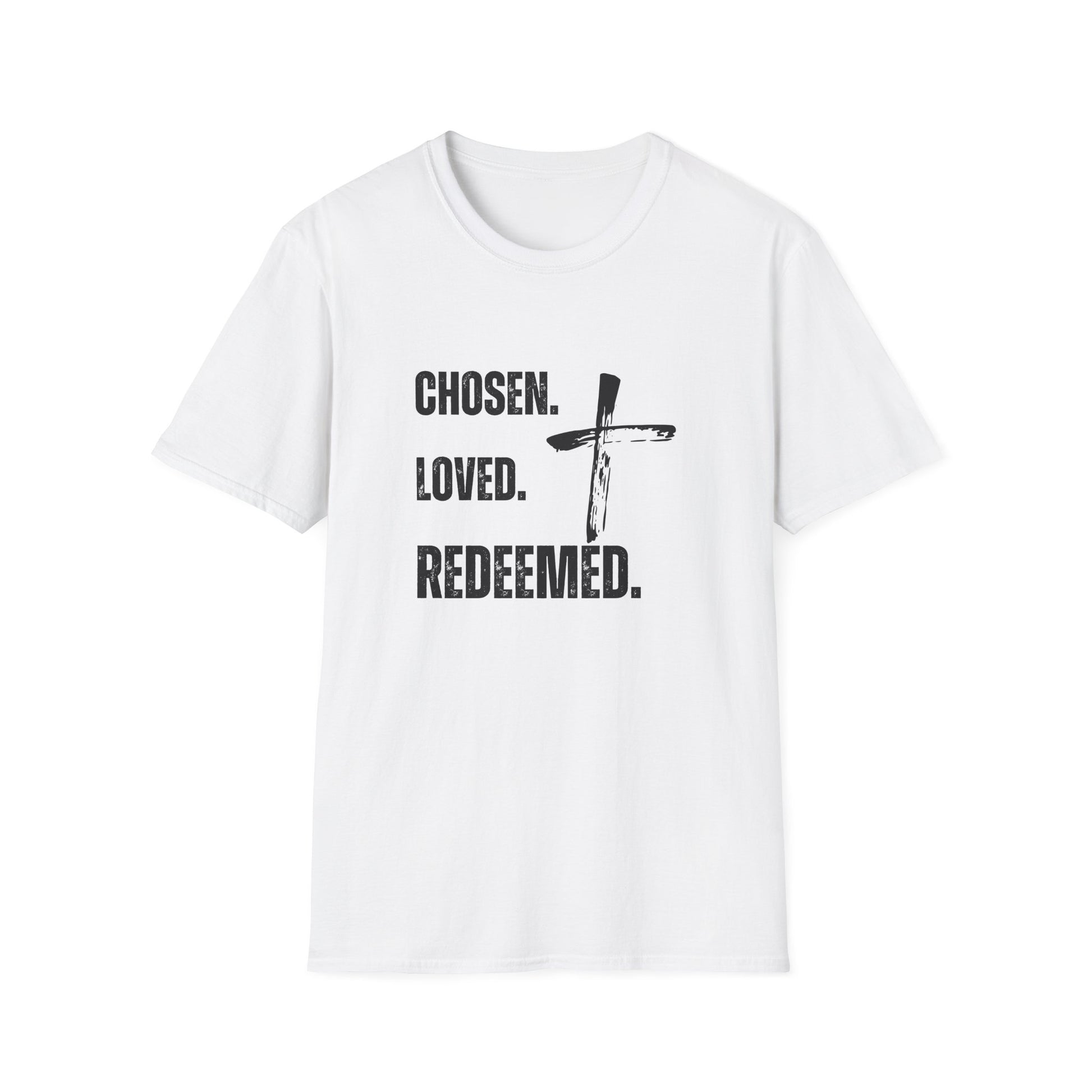 Embrace your faith with this unisex t-shirt, featuring the inspiring words "Chosen. Loved. Redeemed." Crafted from 100% ring-spun cotton, this lightweight tee offers unparalleled comfort. It's perfect for everyday wear, making it easy to express your beliefs while staying stylish. Ideal for adults who cherish meaningful messages, this shirt suits various occasions, from casual outings to church gatherings. It's a thoughtful gift for holidays like Easter, Christmas, or any moment you want to spread positivity and hope.